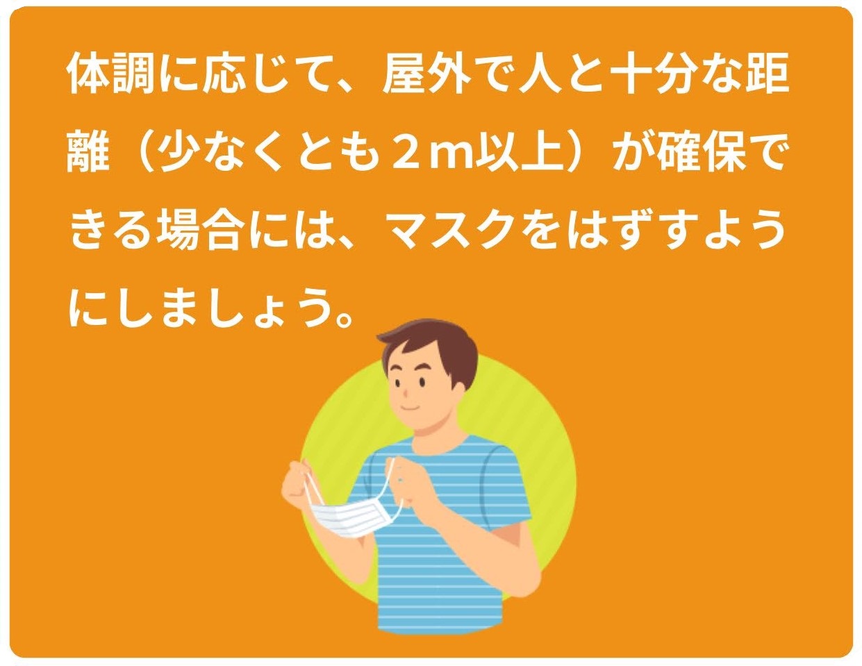 マスクをする場面・しない場面をきちんとわけて、マスクによる熱中症・酸欠といった健康被害から身を守りましょう。