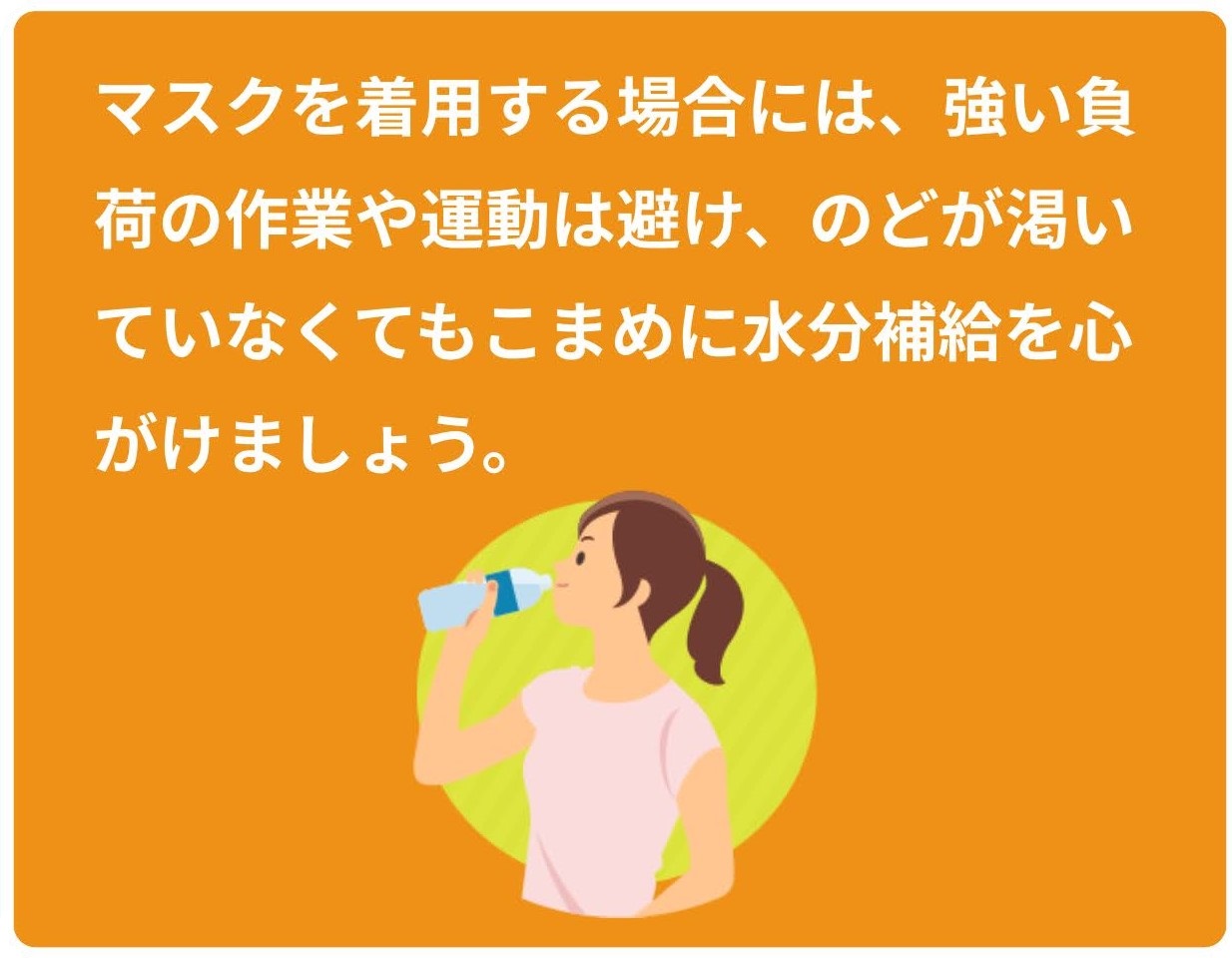 マスクをすると心拍数・呼吸数・血中二酸化炭素濃度・体感温度が上がり、身体に負担がかかって、気づかないうちに脱水症状になります。